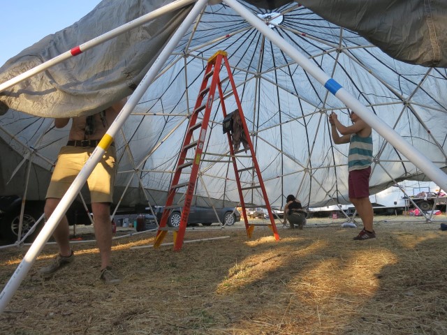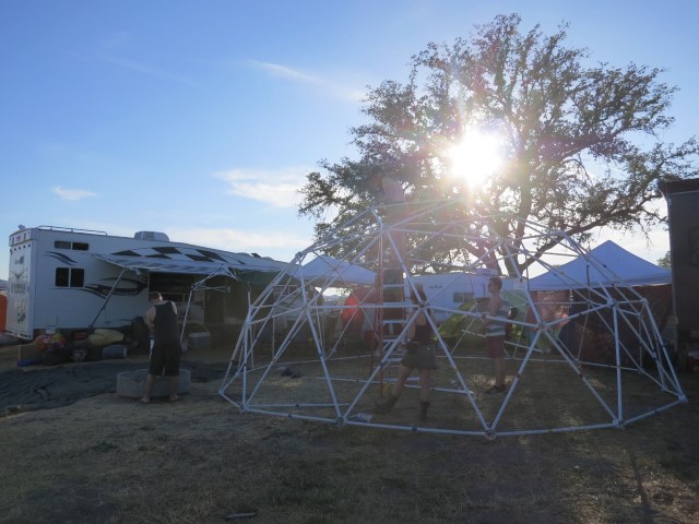 This past weekend we took it to a music festival in Southern California.  The additional 3 photos show the construction and finally putting a parachute over it to cover.  Unfortunately parachutes do not provide great UV protection - it got pretty warm inside during the hot day sun, so for our next trip we'll be rethinking the covering.